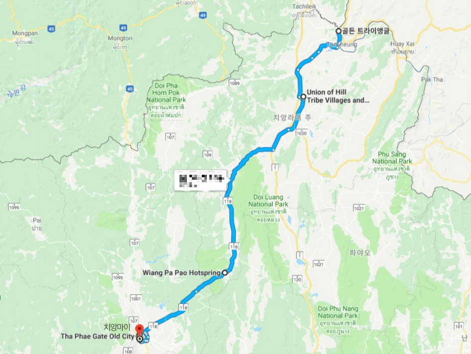 골든 트라이앵글지역에서 고산족 마을을 보고 위앙파파오 온천지를 거쳐 치앙마이로 돌아와서 올드 시티 주변에서 시간을 보낸 궤적이다.