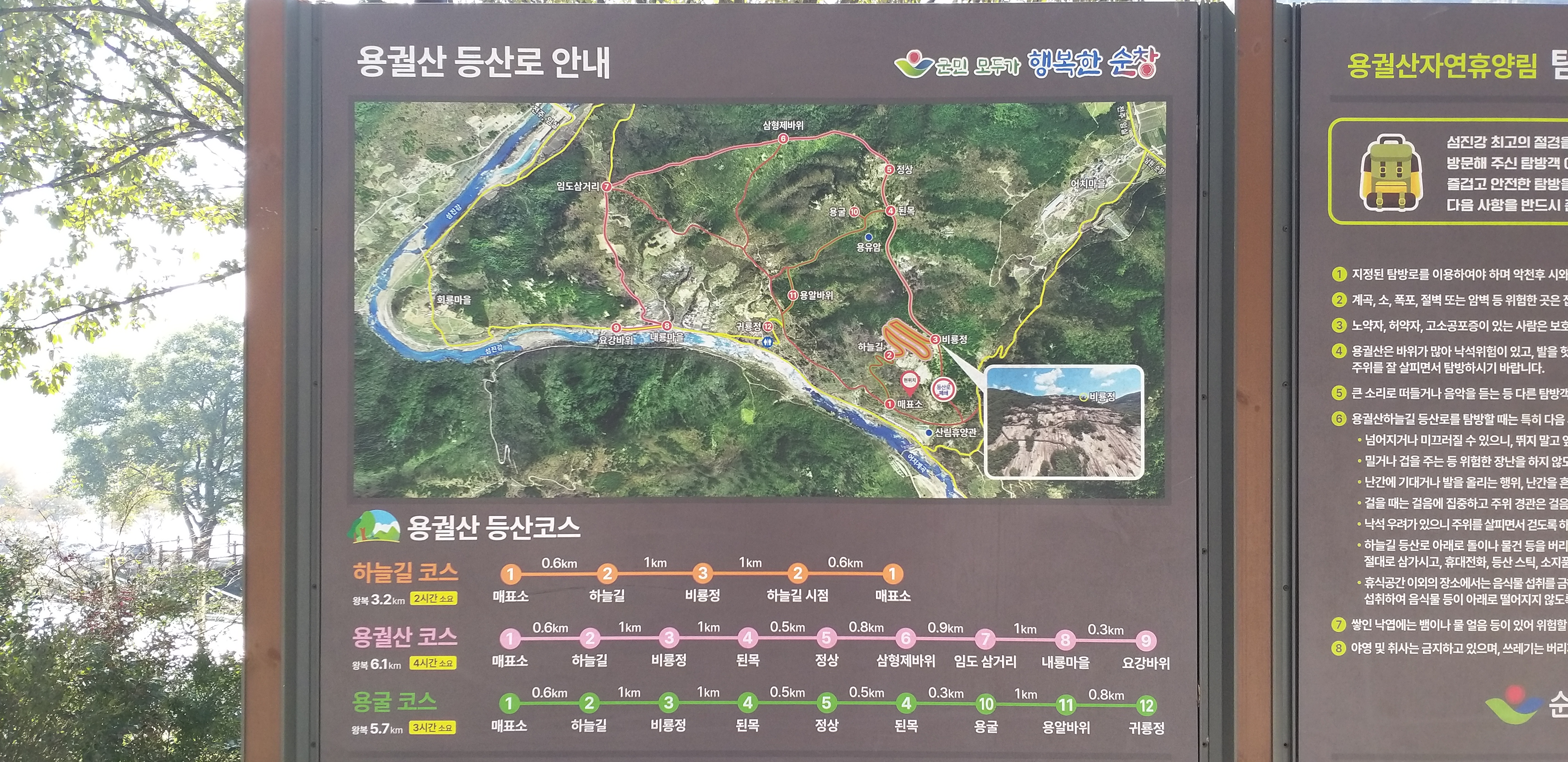 순창은 고추장이 먼저 떠오르지만 알려진 산들도 몇군데 있는데 용궐산에 하늘길이라는 독특한 잔도길이 설치되어 많은 사람들이 찾고 있는 곳이다. 순창 10경에도 포함된 곳인데 순창 IC에서 빠져나오면 바로 로타리인데 강천산과 고추장단지, 채계산 출렁다리 그리고 승마장의 이정표가 보인다.