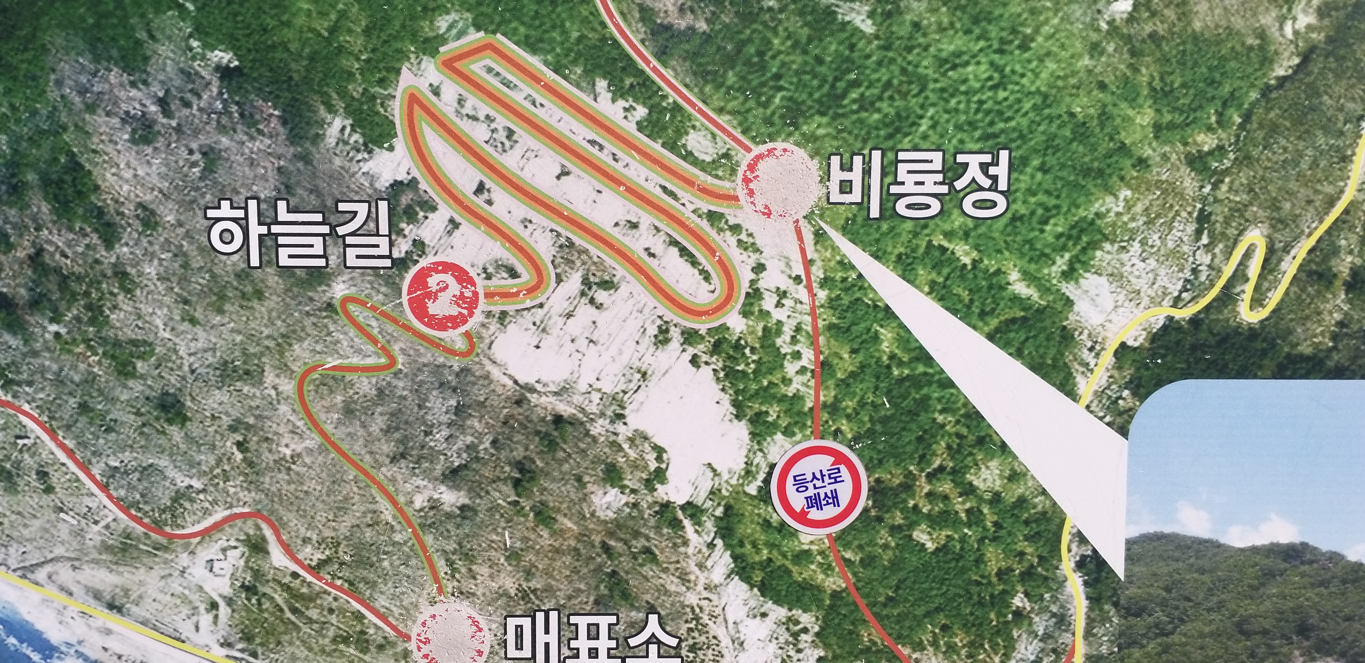 매표소에서 하늘길 비룡정까지는 4번의 방향전환을 하며 설치된 데크 잔도길을 따라 가면 된다.