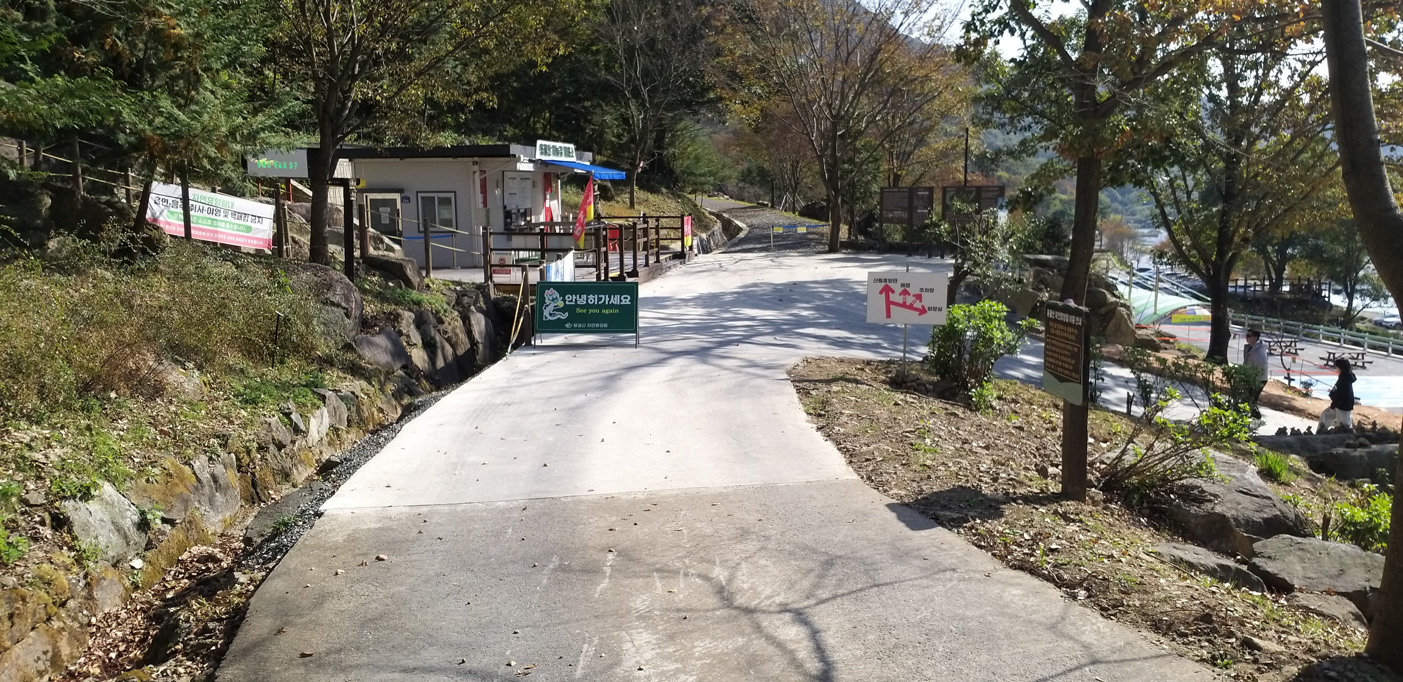 표를 끊고 길로 들어서면 되는데 좌측 세멘트 포장길은 나오는 길, 우측 산길이 들어가는 입구다.
