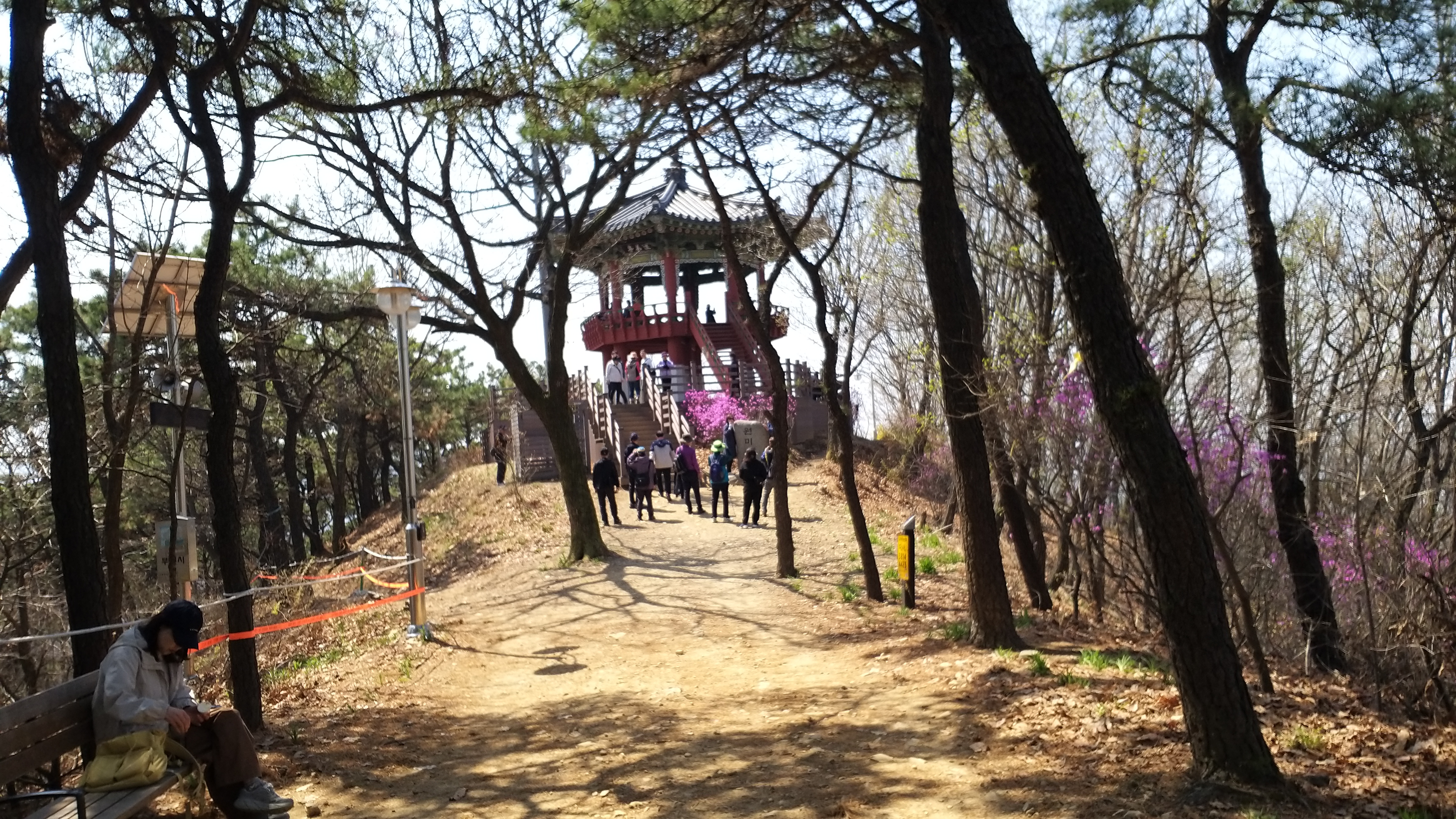 정자에 올라 보지만 특별한 조망은 없다. 아래쪽 하늘다리 전망대에서 보는 조망이 좋다. 산 곳곳에는 진달래가 피어있다.