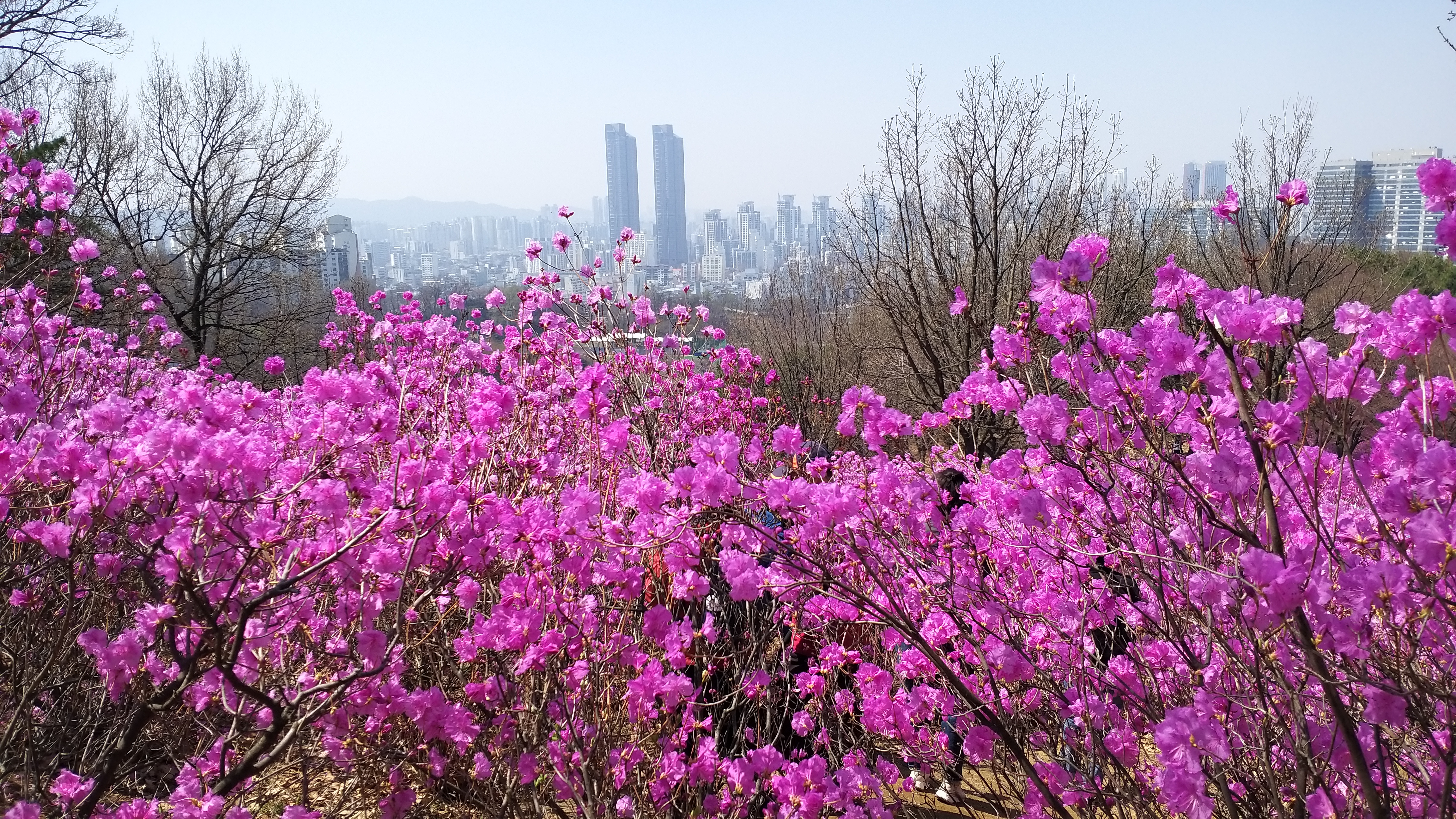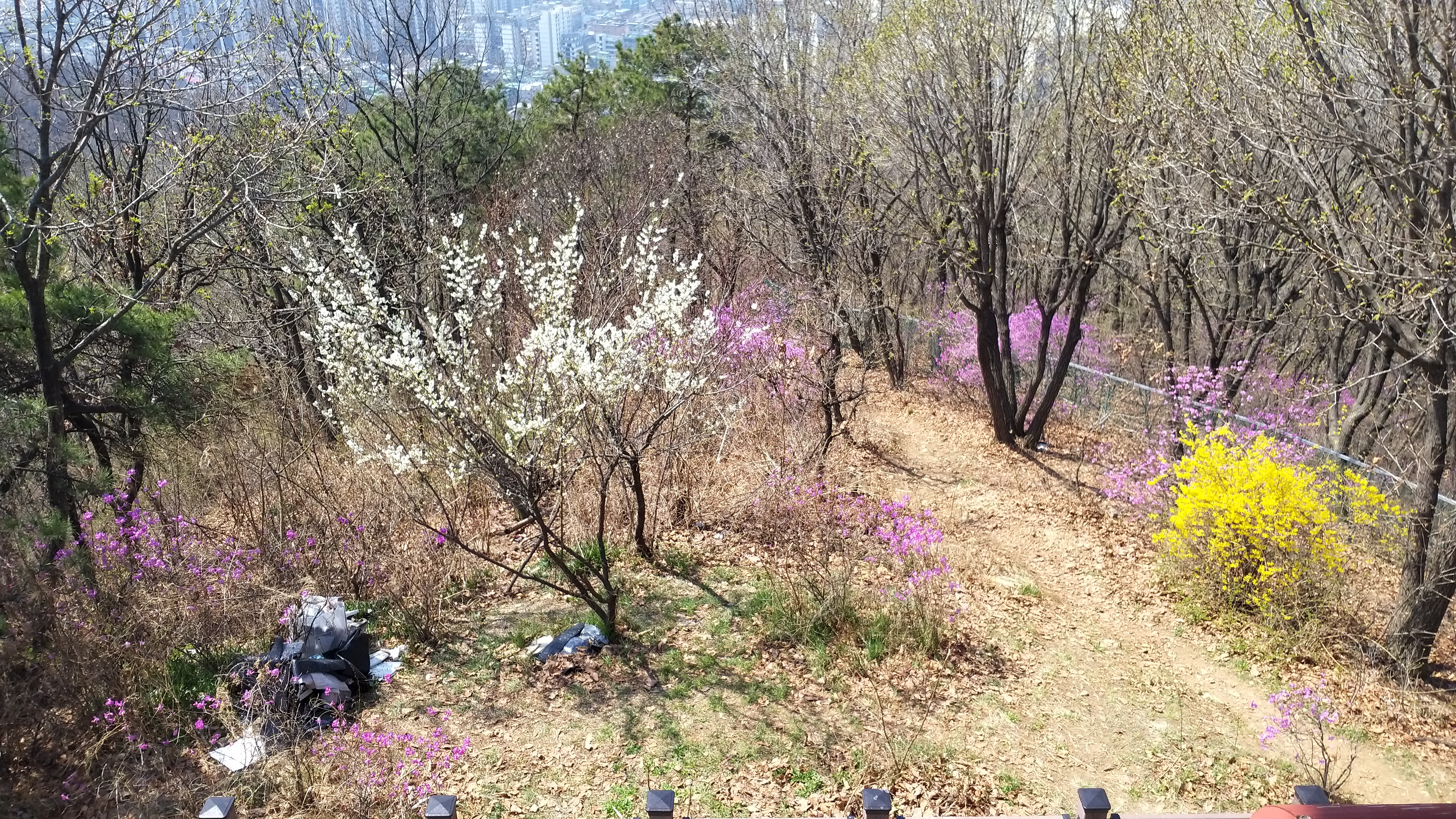 조금 올라와서 뒤돌아보니 진달래 너머에는 벚꽃이 한창 피어있다.